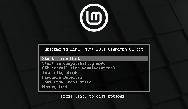 Esimerkki Linux Mintin käynnistysvalikosta (Live USB).